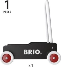 Prachtig afgewerkte zwarte loopwagen. De duwstang kan in 2 verschillende standen gezet worden. Zet deze rechtop voor het kind dat de eerste echte stapjes zet, en zet de stand iets schuiner voor kinderen die al iets beter kunnen lopen. Zo krijgen ze wat meer bewegingsvrijheid.