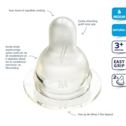 Medium: vanaf 3 maanden of als small te langzaam gaat. Geschikt voor dunne en dikke voeding zoals melkvoeding (borstvoeding of met melkpoeder) en pap. 2 stuks per verpakking. De speen is vervaardigd uit zacht, veilig BPA-vrij siliconen materiaal. Ontwikkeld door Difrax medisch team. Tip: Met de 1-2-3 speen en 1-2-3 ring van Difrax bepaal je de drinksnelheid van je baby, ook tijdens het voeden.