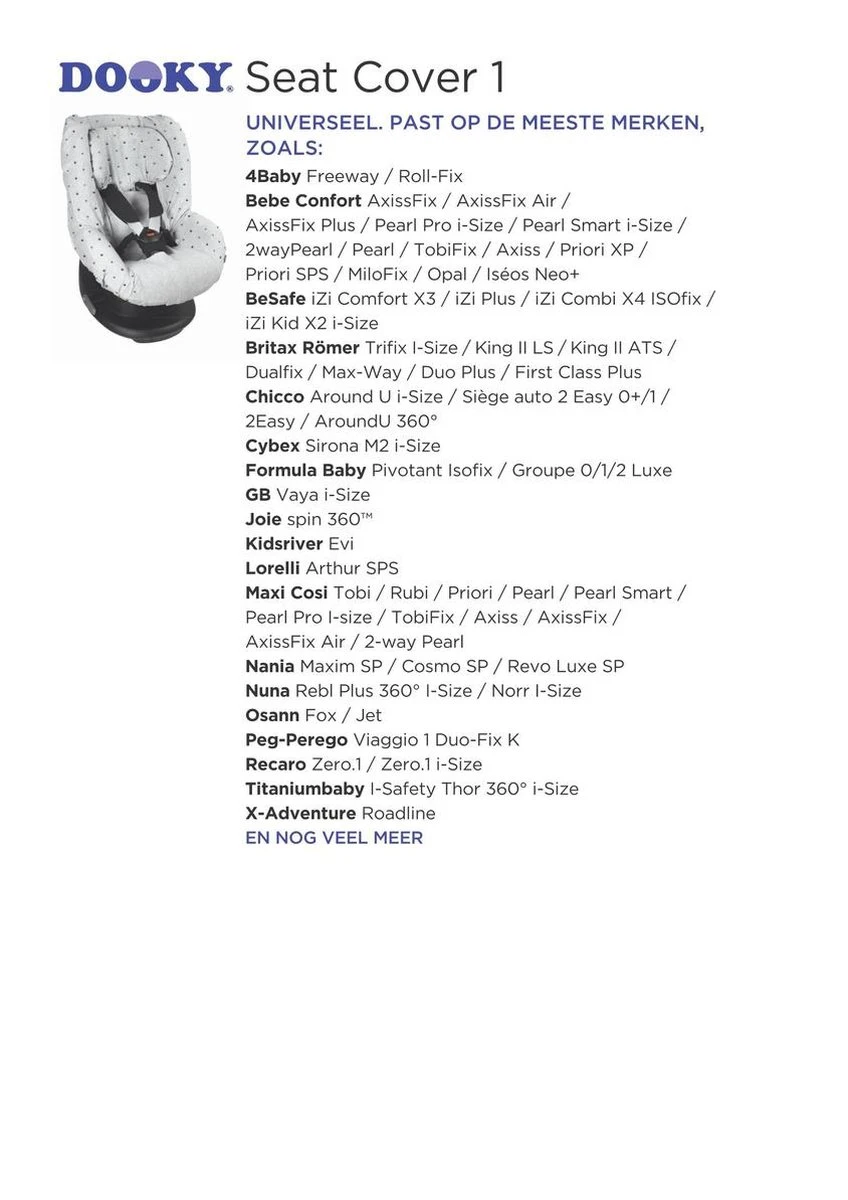 Verkrijgbaar in vele verschillende dessins en kleuren, is er voor ieder wat wils. En om het helemaal af te maken, zijn er bij Dooky bijpassende producten verkrijgbaar. Bijvoorbeeld een UV-bestendige zonnekap, gordelbeschermers, voetenzakken, dekentjes, slabbetjes, en zelfs zonnebrillen. Allemaal verkrijgbaar in bijpassende kleuren en dessins. Dus welk merk autostoel je ook hebt, je kunt deze helemaal opleuken in de stijl die jij wilt!