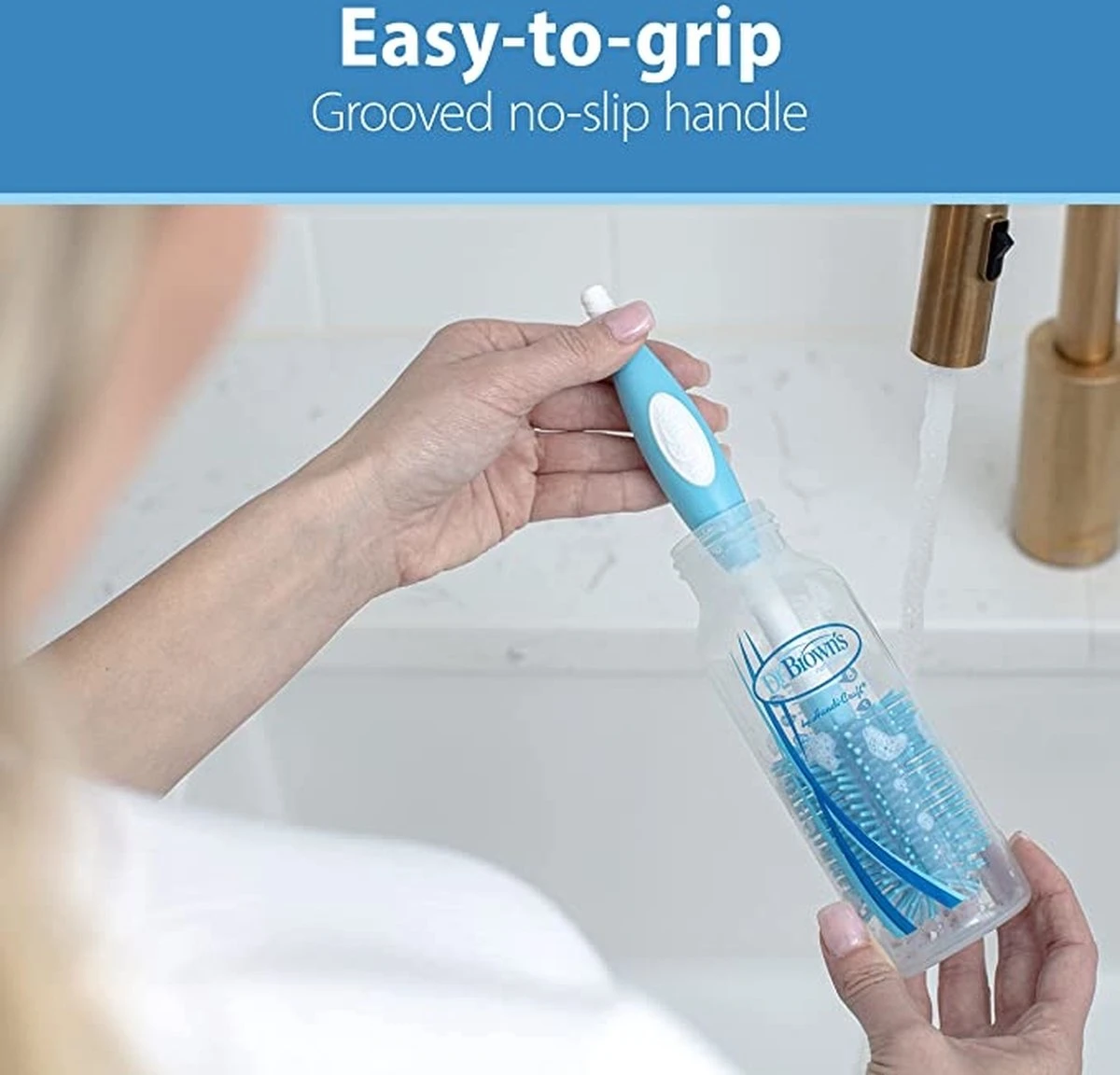 Krasvrij schrobben ontmoet een duurzaam ontwerp in de Soft Touch Bottle Brush, waardoor u een grondige en efficiënte flesreinigingservaring krijgt. Krijg een stevige grip op het no-slip gegroefde handvat, of je nu de borstelkop of de speciaal ontworpen geribbelde tepelreiniger in de basis gebruikt. De Dr. Brown’s Soft Touch Bottle Brush is volledig metaalvrij, waardoor het zowel vaatwasser (bovenste rek) als sterilisator veilig is. Gebruik de zuigclip voor sanitaire opslag aan de spoelbakzijde.