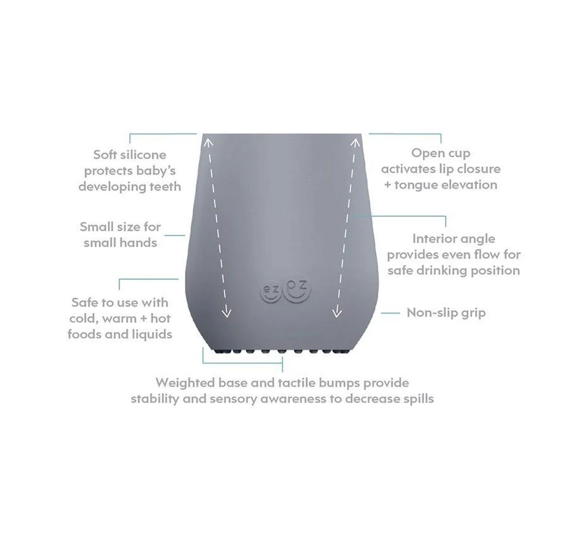 Cup is flexibel en kan dus naar het mondje gevormd worden (vooral handig bij het helpen door de ouder en bij gebruik als feeding cup). De silicone werkt als anti slip. Een baby moet met 12 maanden in staat zijn zelfstandig uit een open beker te drinken. Het gebruiken van de Tiny Cup bereid ze daar op voor.
