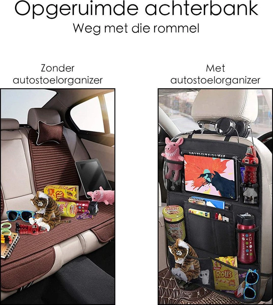 Onderweg met je kindje wil je van alles meenemen om je kindje te vermaken en tevreden te stellen. Bijvoorbeeld een tablet, speelgoed, flesjes, speentjes, tissues, noem het maar op! Maar waar berg je dit allemaal op, zonder een rommeltje in de auto te krijgen en je spullen kwijt te raken? Dankzij deze handige Flokoo autostoel organizer met negen verschillende opbergvakken kan je alle spullen van je kindje gemakkelijk opbergen. De organizer bevat tevens een tablethouder, zodat je kindje onderweg ongestoord en comfortabel zijn favoriete filmpjes kan kijken en jij als ouder ontspannen kunt rijden!