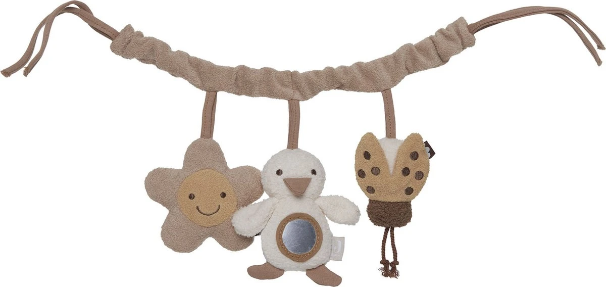 Vind je het ook zo heerlijk om een wandeling te maken met je kleintje? Om voor vermaak te zorgen van je baby tijdens jullie ommetje, is een wagenspanner ideaal. Bovendien ziet dit er ook nog een super schattig uit en stimuleert het de ontwikkeling! De wagenspanner heeft 3 leuke knuffeltjes: een bloemetje, een eendje en een lieveheersbeestje. Alle knuffeltjes hebben een knisperelement. Het eendje heeft daarnaast nog een spiegel op zijn buikje. Het bijtje heeft een zacht belletje. Dit zal zorgen voor urenlang vermaak! Je kunt de wagenspanner gemakkelijk aan de kinderwagen of Maxi Cosi bevestigen. Ben je op zoek naar een enkele hanger? Bekijk dan ook de schattige wagenhanger Duck van Jollein.