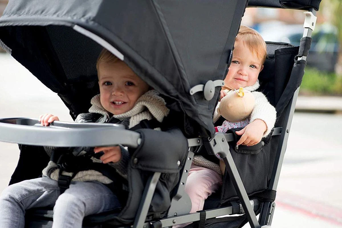 Bij het lopen met een baby is het eenvoudig om een reissysteem te creëren met de meegeleverde universele adapter voor het autostoeltje. De grote kap zorgt voor voldoende dekking en de achterkapverlenging dekt het achterste kind tijdens het zitten. Gekoppelde parkeerremmen en vering op alle wielen zorgen voor een soepele rit voor uw kinderen. We hebben ook een organizer met twee bekerhouders en een vakje met rits voor sleutels, portemonnee of telefoon geïntegreerd.
