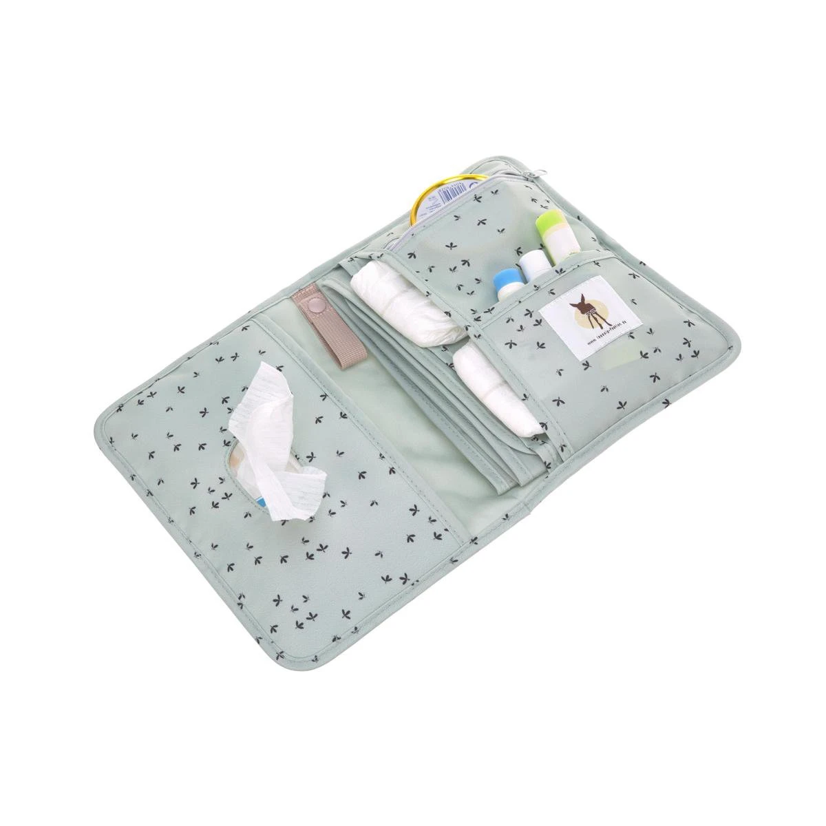 Functionele toepassingen zorgen voor een snelle en gemakkelijke luierwissel. Een compartiment voor natte doekjes met een praktische opening, verschillende zakken voor luiers en dergelijke, een zakje met ritssluiting, evenals een tape voor het bevestigen van een fopspeen, maken dit een praktisch accessoire. Een waterafstotende, zacht gevoerde verschoningsmat die past bij de tas, zorgt voor een optimale luierwissel voor de baby.