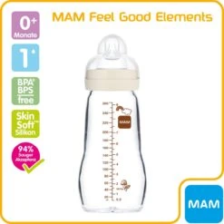 MAM Feel Good glazen fles, 260 ml Fles met wijde hals van hoogwaardig glas, bijzonder hitte- en temperatuurbestendig, hygiënisch en duurzaam.