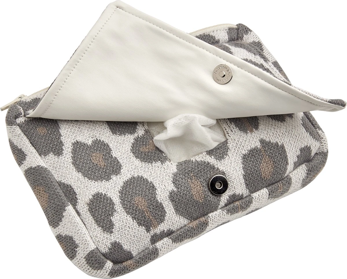 Super handig: deze Meyco Baby Billendoekjesetui! De etui is gebreid met een trendy panter design. Via de rits aan de zijkant kun je een standaard pak billendoekjes in de etui plaatsen. Het klepje aan de bovenzijde is aan de binnenkant voorzien van waterafstotend materiaal waardoor de doekjes niet uitdrogen. Handig voor in je tas, maar staat ook heel leuk op de commode.