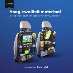 De organizer bevat een hoge kwaliteit 600D polyester. Deze is stukken veiliger, duurzamer en efficiënter ten opzichte van ‘normale’ organizers. Het materiaal past perfect bij deze organizer, het zorgt er namelijk voor dat er niks omvalt in de auto en er niks stuk gaat. Ook voorkomt het vlekken, krassen, vuil en slijtage aan de achterkant van uw stoel.